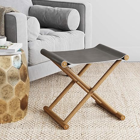 Amazon Com Nathan James 26002 Campaign Foot Stool Ottoman Stool Or Foldable Vanity Stool With A Solid Wood Accent Stool Frame And Soft Vegan Leather Seat Gray Furniture Decor